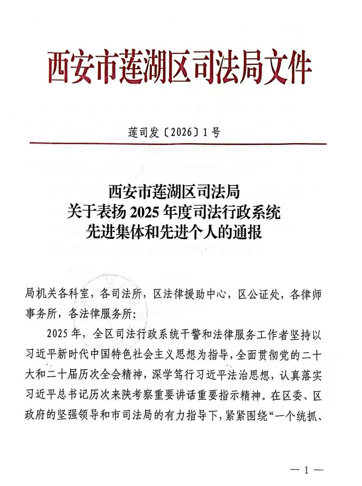 2026年4月23日,莲湖区司法局发布《关于表扬2025年度司法行政系统先进集体和先进个人的通报》,我所秉持诚实守信、专业笃行、务实致远、服务为民的核心理念,荣获多项表彰。